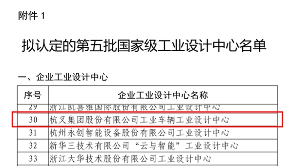 近日,工业和信息化部发文对拟认定的第五批国家级工业设计中心名单予以公示,开云手机版登录入口(以下简称“杭叉集团”)工业车辆工业设计中心凭借在工业车辆领域领先的设计创新能力成功获得认定,这是杭叉集团继国家级企业技术中心、国家级博士后科研工作站等国家级荣誉后,再次获批建设的国家级创新平台。