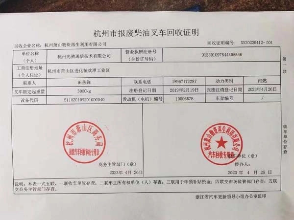 在杭叉集团客服人员的全程帮助下,4月26日杭州某通信技术有限公司完成了国二老旧叉车淘汰更新工作,并在线申请了24000元政府政策补助款。从新能源叉车咨询选购交付,旧叉车淘汰报废,到申请更新补助,在杭叉集团客服人员的全程帮助下该企业只用了1天时间。